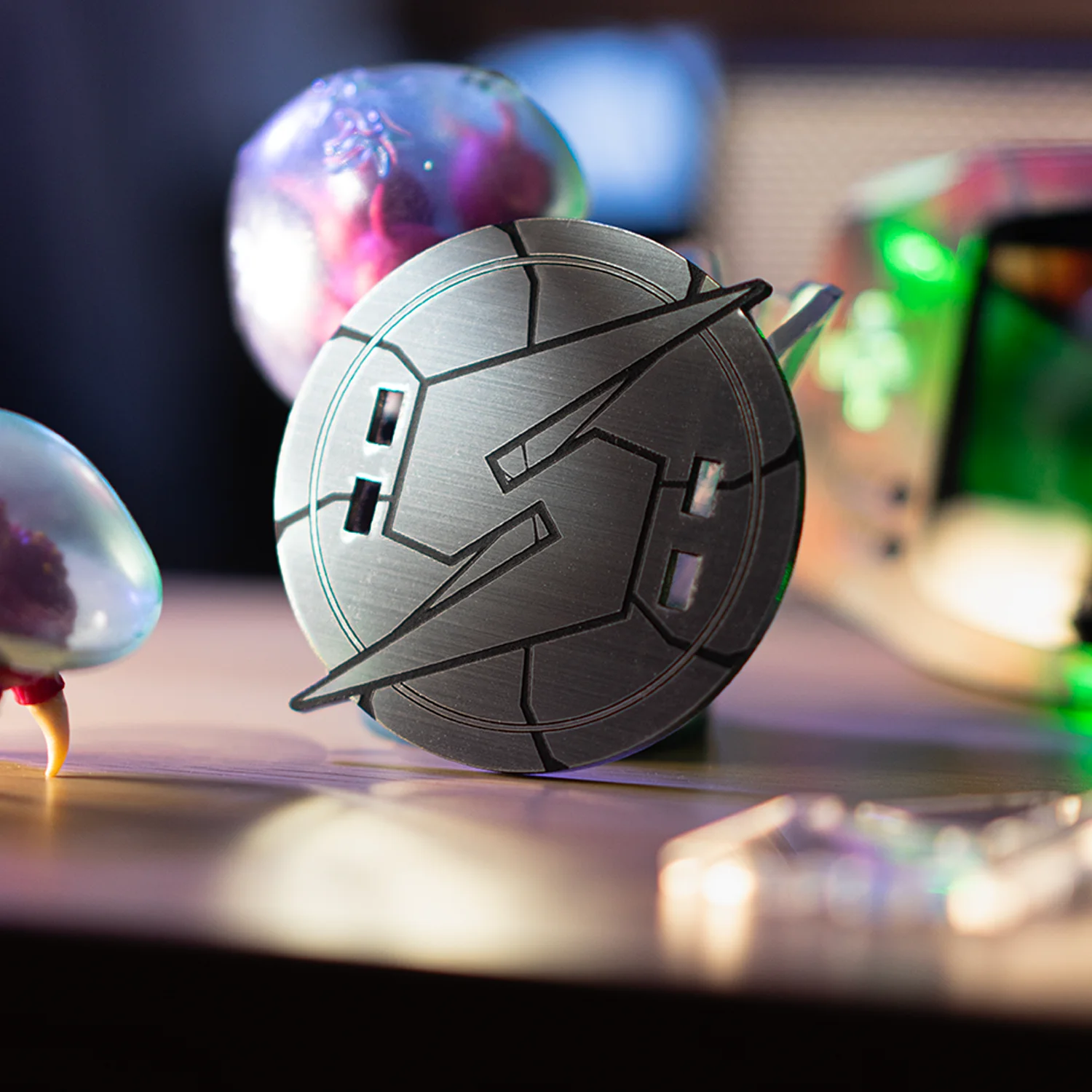 L’impression UV met en valeur chaque détail de son exosquelette futuriste. Posée sur un socle Metroid unique, elle est sublimée par un éclairage LED illuminant la visière emblématique de Samus.